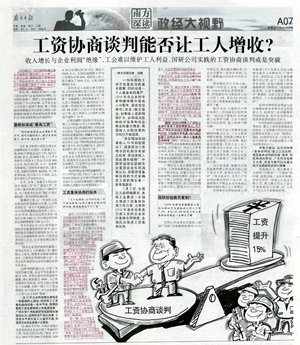 7月14日,《南方日报》以为题,用三分之二大版篇幅报道广州市国研机械设备制造有限公司实践工资集体协商的成功经验。