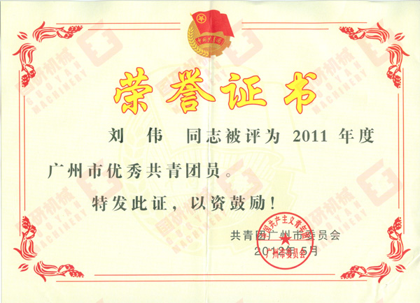 2012年6月,国研机械公司刘伟同志被共青团广州市委员会评为“2011年度广州市优秀共青团员”。