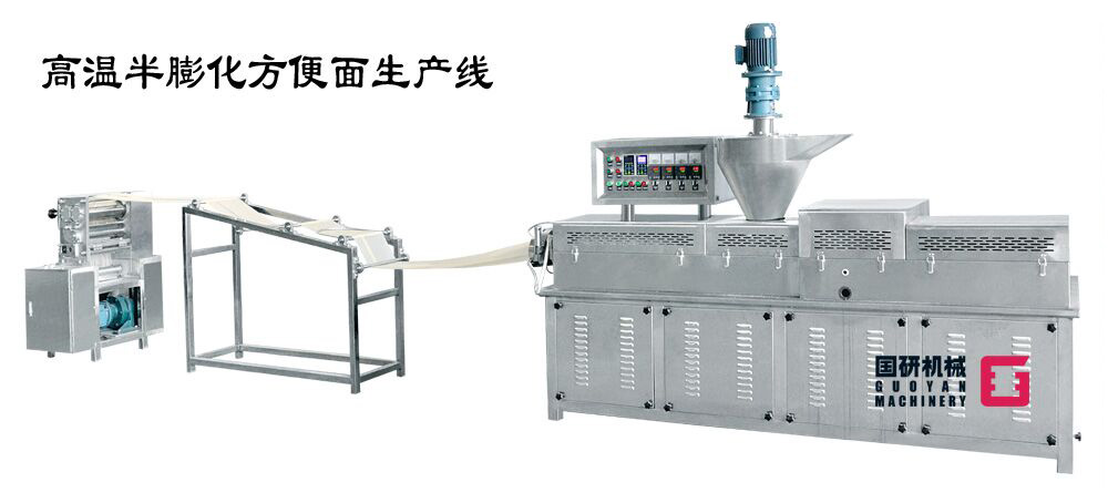 非油炸方便面生产线,是集自动和面、自动加料、挤压膨化、面片冷却输送、自动切条、分行输送自动提升、加湿回软切断、自动落盒成形、自动干燥到成品输送入包装于一体的全自动生产线。该设备主要应用于挤出式非油炸快食面的生产,工艺流畅、功能齐全、自动化程度高,机器出品稳定,工艺技术强于国内同类生产设备,是油炸方便面厂家更新换代的理想选择。