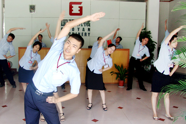 每天早上8:30,随着公司团支部书记李运喜一声哨响,健身活动正式开始!全体员工迅速集合,不到两分钟,就在健身场地排起了整齐的队伍,一个个精神抖擞、神采奕奕。体育专业出身的团员青年朱承容,站到队伍前列给大家当教练。公司高管带头参与,大家整齐划一练起来。“第一节,头部运动,一二三四五六七八…… “教练”认真,“学员”用心,整个健身场面生动、气氛活泼、积极向上。
