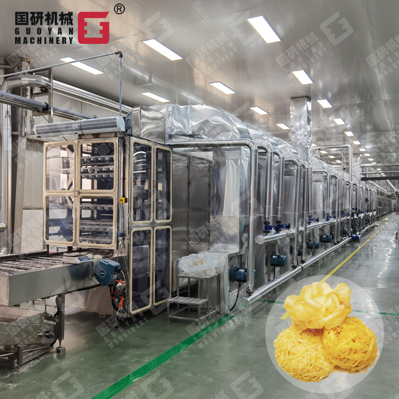 非油炸方便面生产线,是集自动和面、自动加料、挤压膨化、面片冷却输送、自动切条、分行输送自动提升、加湿回软切断、自动落盒成形、自动干燥到成品输送入包装于一体的全自动生产线。该设备主要应用于挤出式非油炸快食面的生产,工艺流畅、功能齐全、自动化程度高,机器出品稳定,工艺技术强于国内同类生产设备,是油炸方便面厂家更新换代的理想选择。